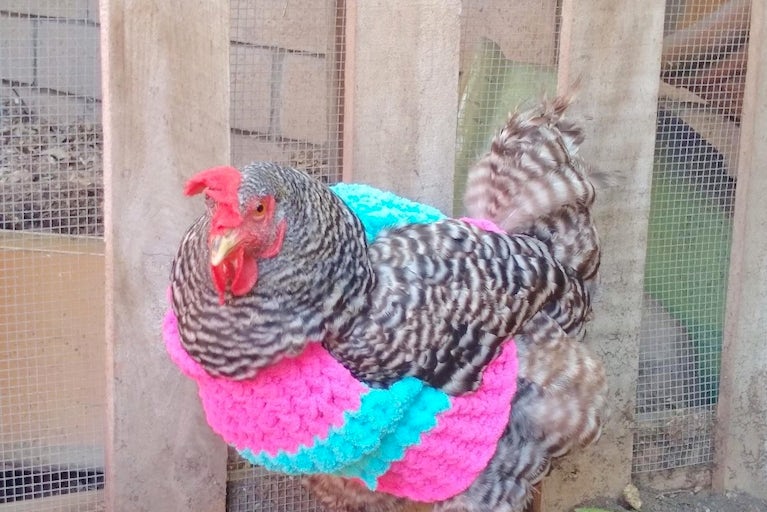 Sadly, your favorite backyard chicken might not be it. While proponents of chicken sweaters say their birds are more comfortable when dressed for the season, detractors say the sweaters could cause more problems than they solve. The well-meaning knitters and crocheters cranking out dashing capes and jumpers to protect poultry from winter chill may in fact be impeding chickens’ ability to regulate their body temperature naturally, which they do by fluffing their feathers. Even for molting birds with featherless patches, clothes can be problematic because they can damage nascent pin feathers. Even worse, those sweet little sweaters apparently make the perfect carrying case for hungry hawks looking for a grab-and-go chicken dinner.