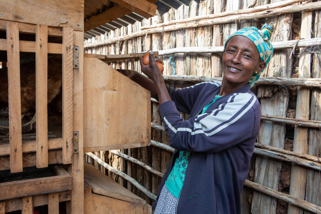 In Ethiopia’s Gurage Zone, Genet Lametu collects eggs from her hens. Once limited by high feed costs and traditional rearing methods, she joined Heifer’s Enhancing Livelihoods of Smallholders through Improved Poultry Business project and received 30 chicks.