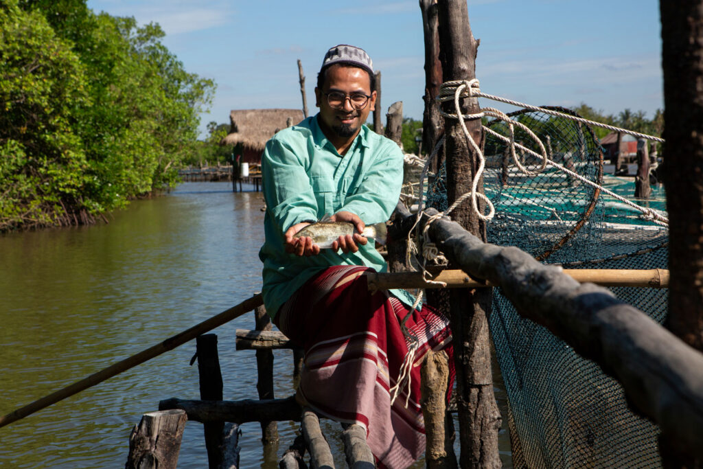Along a coastal waterway off the Gulf of Thailand in Cambodia, Sab Kasim tends to large mesh enclosures where he raises Asian sea bass. Once reliant on unpredictable tides and borrowed boats, he now raises fish year-round as a steady source of food and income for his family.