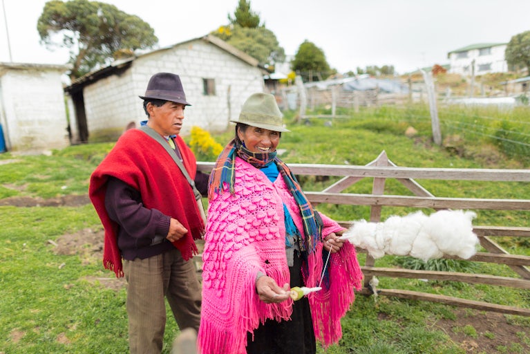 María Micaela Castro Sisa is an alpaca farmer who lives in Ecuador’s windswept Andean páramo, a treeless plateau between the tree line and the snowy peaks. Each piece of her colorful outfit represents her community’s heritage.