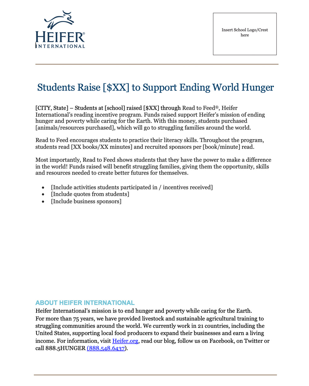 Share your students’ Read to Feed successes with local media. Use this sample press release to get started!
